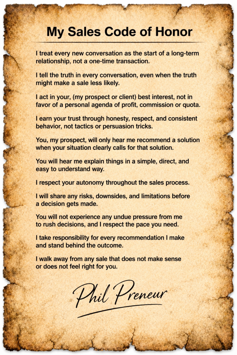 Without a sales code of honor, behavior can shift depending on your deal. With an established sales code of honor that you follow, your behavior stays consistent no matter who sits across the table or is on the call or screen, and the situation. That consistency becomes noticeable. Prospects recognize and give trust to consistency and direct answers.